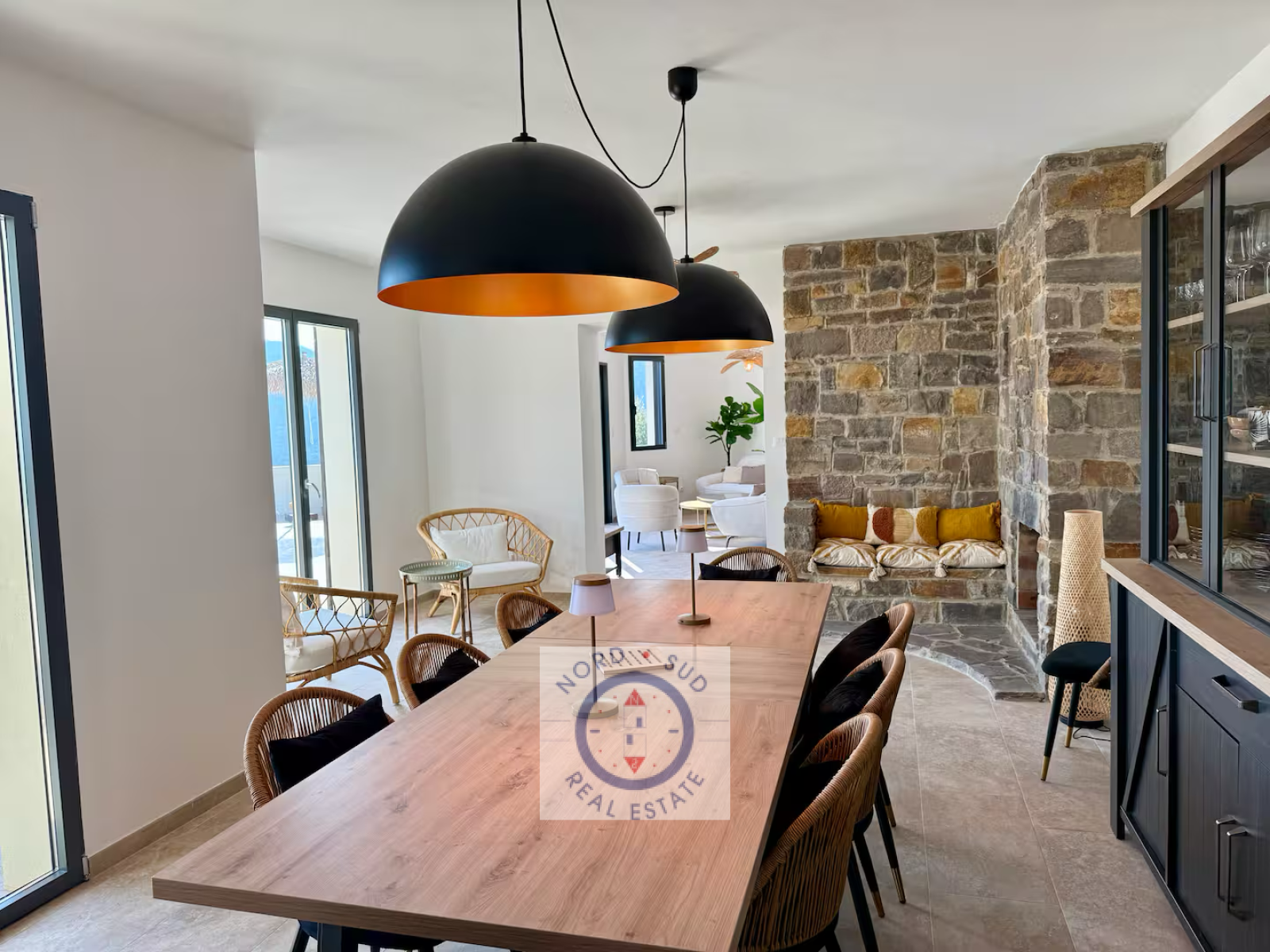 Au rez-de-chaussée, une salle à manger conviviale, parfaite pour partager de longs repas d’été, fait écho à la cuisine indépendante, entièrement équipée et pensée pour cuisiner en toute sérénité.